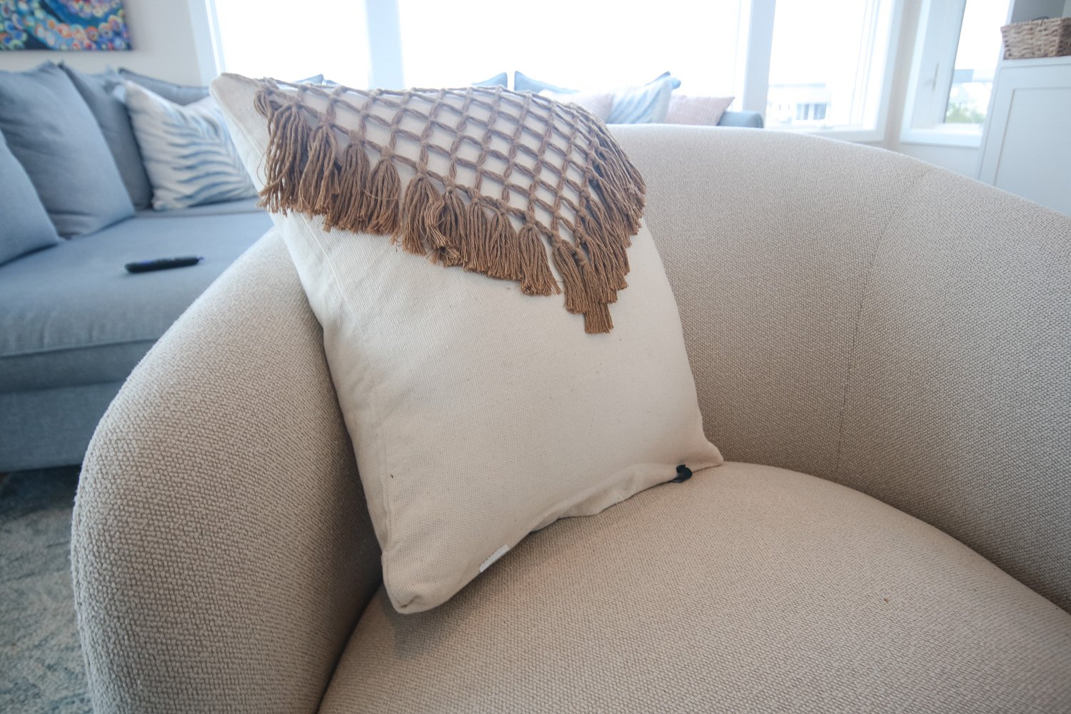 Textured fringe details in warm sand tones. Bohemian luxury with natural, touchable appeal.